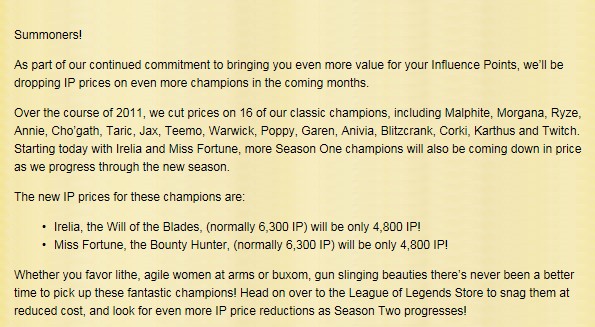 美服将对[刀锋意志-艾瑞丽雅]及[赏金猎人-厄运女郎]进行金币降价,两位英雄之前的金币售价均为6300,降价后更改为4800。