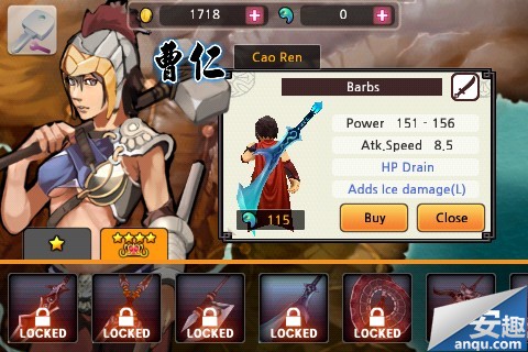 首先我们需要打过3关,当作熟悉操作,打过三关后会出来一个曹仁,就是图上第2个还有提示,到4星武器的界面,可以看到武器的价格是60蓝玉。