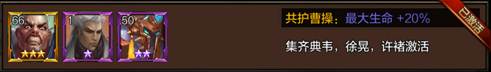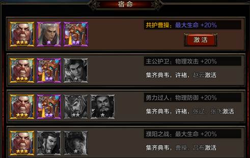 点击上图右侧下部的宿舍所在的区域,可以跳转到宿命系统界面。当玩家集齐指定的武将组合后,可以在宿命系统界面激活对应的宿命,比如下图中典韦的宿命“共护曹操:最大生命+20%”。我们注意上图中典韦自身属性的最大生命值为32306,如果此时我们激活这个宿命,可以预见典韦的最大生命值会变为:32306*(1+20%)=38767.2。
