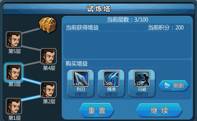 5.每通关一层将会出现可获得的3个随机的BUFF,需消耗积分分别购买。玩家也可使用钻石进行全部刷新。BUFF被购买后,刷新时该BUFF将不能被刷新。