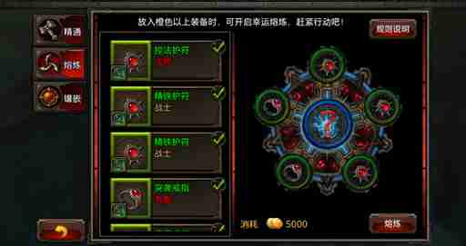 最爱的就是这个系统了,没有之一。头一回遇到这种搞装备的游戏,简单来说就是绝对成功的5件同品质装备熔炼成1件更高品质的装备,不用去刻意刷、做装备。