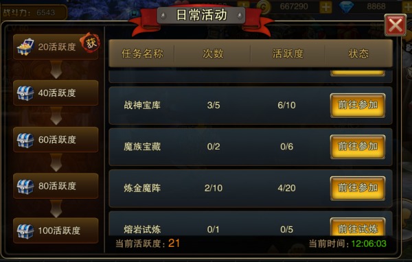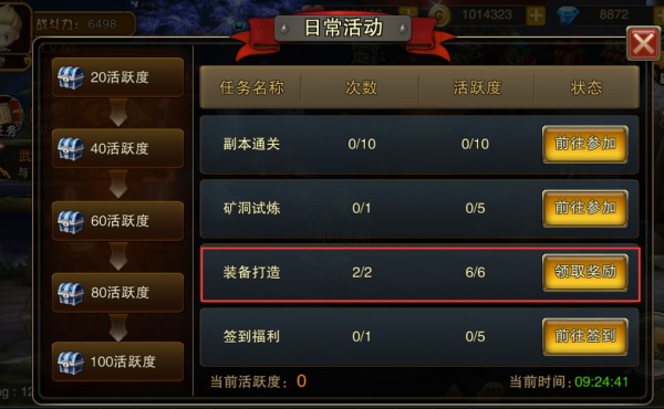 每种日常活动每天都有限制次数,例如装备打造,每天可以打造2次,完成之后达到6点活跃度,这时就可以领取奖励啦~~