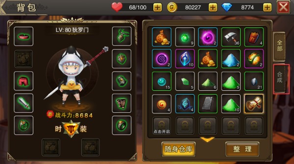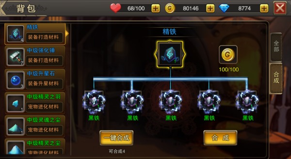 游戏里的合成功能整合在背包界面中,点击右侧的“合成”进入合成界面。