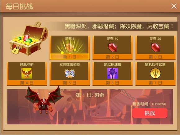 副本进度50关之后,每日挑战按钮就在主界面解锁了。每日挑战中共有七个强大的BOSS,你需要在7天日时间内连续击败它们,才能获得每日挑战的全套奖励。每日挑战奖励中的凤凰守护、双倍嫦娥、地狱招魂幡、伙伴武器都价值非凡;另外,每日挑战中的双倍嫦娥会持续24个小时,真的超值超凡哦!