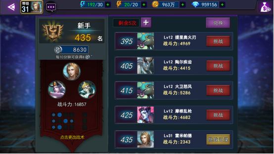 大家可以选择挑战比自己战力高的玩家。无论失败或胜利,都将得到竞技点。可在商店兑换使用。根据当前排名,每隔10分钟都会获得相应积分。排名越高积分越多。排位赛共分为7个组别,为新手、青铜、白银、黄金、白金、钻石和最强王者。更待的排名可开启晋级战。排位赛中,双方均为自动战斗,不能手动操作哦~~
