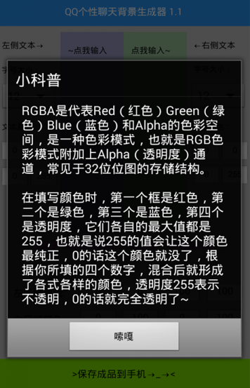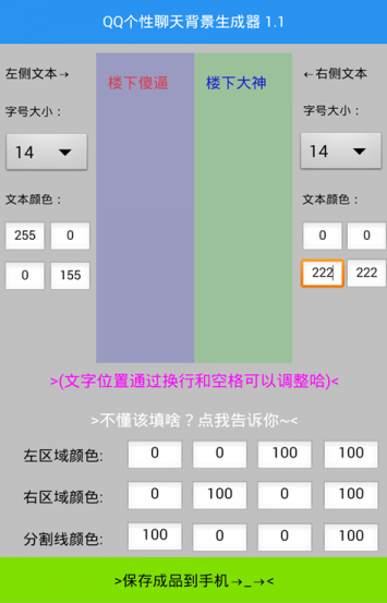 QQ个性聊天背景生成器是一款最近比较流行的一款安卓手机软件,可以用来生成一左一右左右分隔的聊天背景图片,软件使用很简单,只需几步就能亲手DIY出各种个性的QQ聊天背景。让聊天更炫更有个性!赶快来下载制作吧!