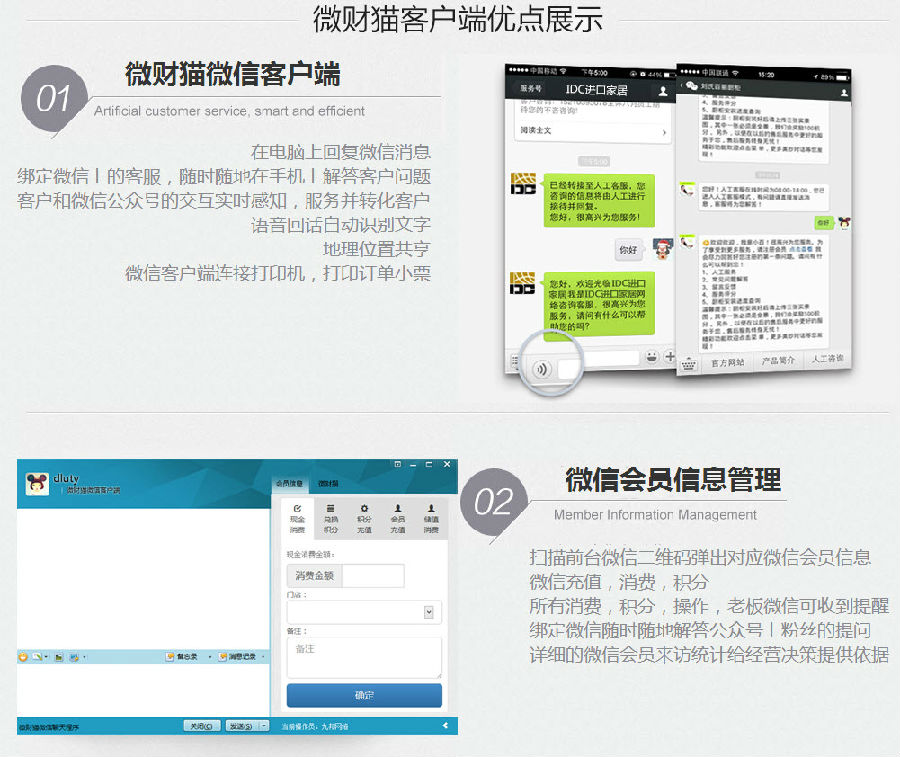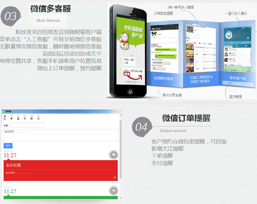 微财猫客户端主要服务于微信服务号商家。在线客服,人工会话客服接待,专业、快速、便捷。商家可以通过微财猫客户端,一对一与客户交流沟通,了解客户需求,在线解答客户咨询的问题,方便商家管理会员,备注,渠道分析。免去了商家登陆微信后台的烦恼,简单便捷。海量好友,分组管理,信息永久保留,信息漫游,云存储。同一平台,同时运营微财猫客户端和微信消息通道,前端人工客服,机器人客服同时接待百倍访客咨询,后台自动分流,无缝转接,实施监管,持续改善服务质量。微财猫客户端:导航菜单,访客分流,会话无缝转接, 自动回复,同一号码多人管理, 一窗口多人聊天,后台监管。微信端:机器人在线,自定义回复,人工会话客服接待,语音会话自动识别文字,地理位置共享,访客轨迹跟踪。