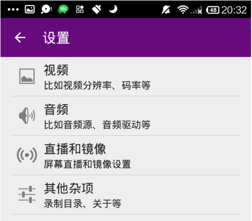 打开设置栏,对视频,音频,直播和镜像进行设置。选择视频清晰度,声音的来源、文件存放位置。