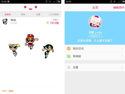 打开软件,可以看到《画皮皮》的界面由简单的三个部分组成,上面是菜单栏包括“皮皮热”、“频道”、“追番”及“二次元速报”,中间是展示每个菜单下的内容,而最下面是关于用户自己的动态、主页及消息,类似微博应用。
