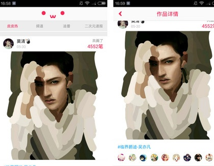 在“皮皮热”中心,用户可以看到许多网友发表的图片或临摹的画,注册之后,可以对他们的动态进行点赞、评论或转发,不同的是回复评论时可以选择自己的图片,也可以选择自己的画作,又或者直接使用文字回复。以下这位绘画大神临摹的吴亦凡,真是栩栩如生,人人点赞。