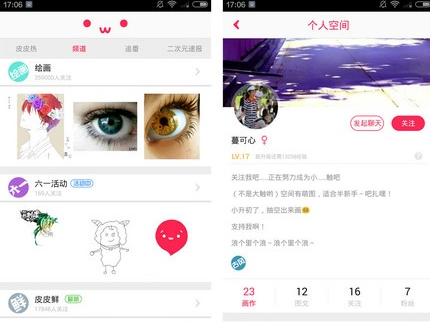 点击“频道”,可以查看自己喜欢的一类作品图,且可对其进行关注,或者选择喜欢的人单独进行关注,也可发起聊天。