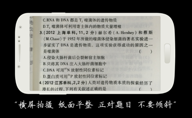 横屏拍摄,纸面平整,正对题目,不要倾斜