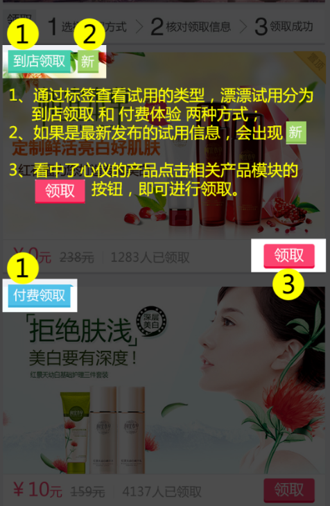 1、选择带有“到店领取”图标的产品进行领取,选择您方便的店铺并填写个人基本信息,提交即可获得试用券一张;