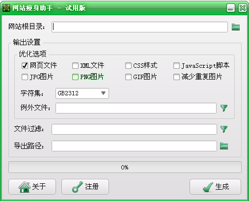 网站瘦身助手是一款方便易用的网站空间优化工具。该软件可以有效解决网站空间容量不足问题,支持对GIF、JPEG、JPG、BMP、PNG等文件空余检测,支持过滤要生成的文件,保证最大限度的减少网站中冗余的图片文件。