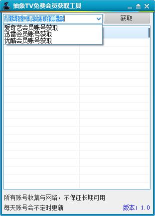 抽象TV免费会员获取工具是一款2016年最新的免费影视会员VIP账号获取器,这款软件可以帮助用户免费一键批量获取迅雷会员、爱奇艺会员和优酷会员账号,每天实时更新,软件没什么好介绍的,操作很简单,大家下下来就知道怎么用了。