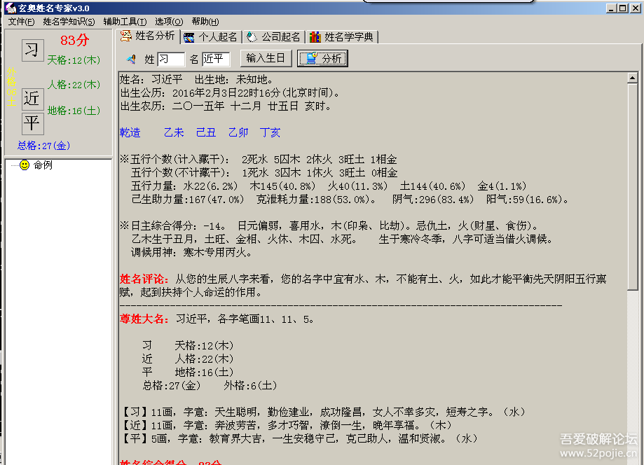 综合了八字和姓名五格、三才配置、81数理来评价姓名,并用百分制来量度姓名的好坏。