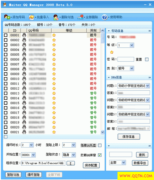 1、协助QQ号码网店店主或手里有大量QQ号码的用户管理QQ号码及相关信息(号码/密码/等级/DNA信息...);