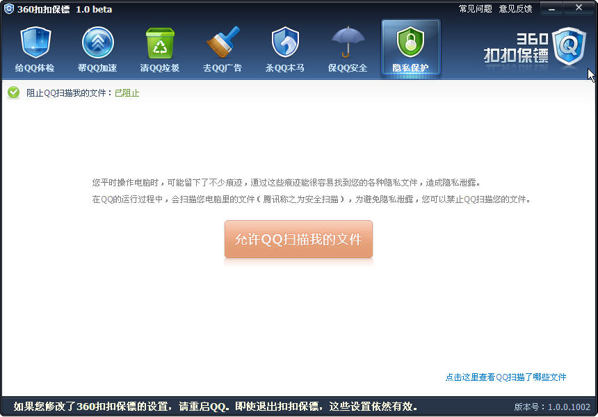 360“扣扣保镖”提供了“阻止QQ查看用户隐私文件”的功能,这是对360隐私保护器功能的进一步完善,用户开启这个隐私保护功能后,就能自动阻止QQ聊天程序对电脑硬盘隐私文件的强制扫描查看。“扣扣保镖”的另一个重要功能是给QQ加速,通过提供灵活的禁用和开启QQ各种插件的功能,可以让QQ启动程序变小,让QQ聊天加速。