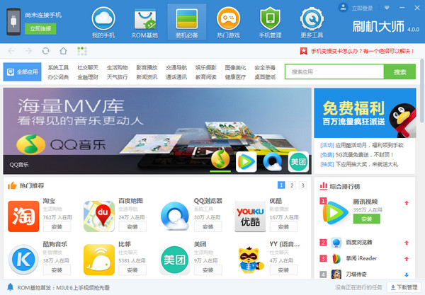 网易云音乐pc客户端v2.10.6.200601 最新版刷机大师是由深圳信一团队开发的一款免费的安卓手机一键刷机工具。为广大安卓用户提供简单、安全、快速、高效的一键式刷机服务。只需选择ROM,按提示点击下一步,即可轻松完成刷机。无论您是新手小白还是刷机达人,都可使用刷机大师轻松搞定安卓手机刷机。另外还有刷机大师手机版为您开启掌上刷机新时代,无需连接电脑也可刷机,为您提供完美的刷机体验。在此版本中更新优化了不少细节,增加了华为G610联通版等25款机型一键刷机,优化新版本的特性展示,手机ROOT授权提醒,读取联系人的权限提示和增加安装驱动失败提示,优化了进入刷机步骤停顿时间过长的问题,修复某些情况下图片显示bug,同时,引用用户积分系统,意味着用户可以靠使用新版本的刷机大师获取积分,换取奖励。