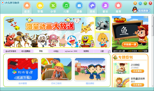少儿学习助手是一款包含了幼儿到小学的视频教学资源的学习软件,该少儿学习软件包括了儿童学英语、儿歌、十万个为什么、幼儿识字、幼儿识拼音、趣味奥数等。另外还有唐诗故事、成语故事、弟子规等,配合上绚丽的动画,让孩子学得更开心,学得更用心。