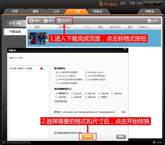 3、下载完成的视频可以进行转码,转换格式到手机上观看。