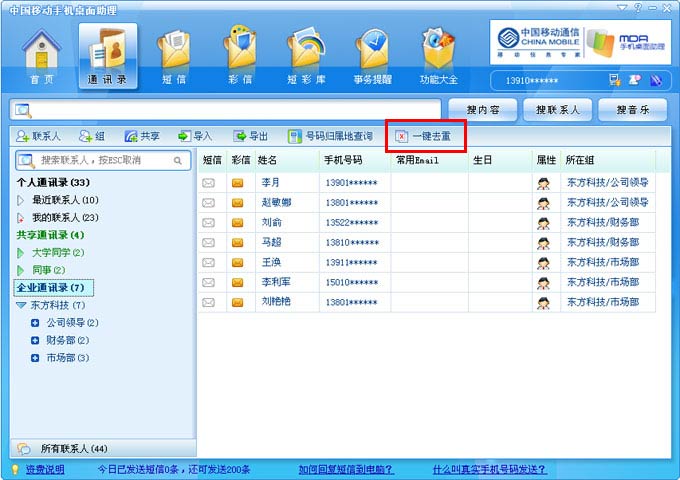 在通讯录上方单击“一键去重”按钮,会弹出提示框,单击“确定”,就可以删除个人通讯录里重复的联系人记录,仅保留一份记录。界面如下图红色区域示: