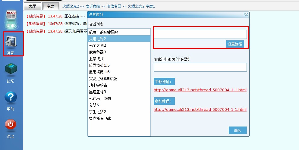 上图,左边是游戏的列表,找到游戏选择好房间,双击加入;下面是这个游戏的简介和下载地址,以及联机教程和意见箱。