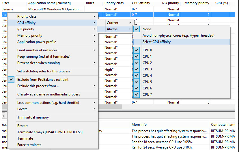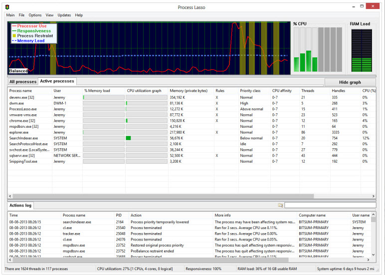 同时它还具备前台进程推进、工作集修整、进程黑名单等附加特性。Process Lasso 对您系统的优化是完全实时+智能的,不会修改任何系统既有配置。且其支持命令行操作和服务器客户端的远程管理,而内核又可脱离用户界面单独运行,因此普遍适用于普通家庭用户和专业工作环境。