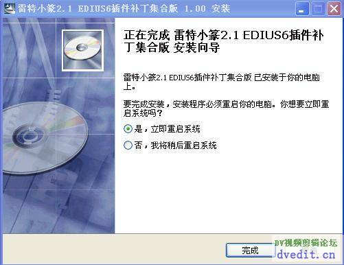 23、点击“完成”结束雷特小篆2.1 EDIUS6插件补丁无提醒版的安装,并者立即重启电脑。