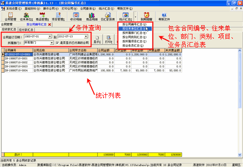 在软件中,汇总有七种分别为:合同编号汇总、往来单位汇总、所属部门汇总、合同类别汇总、所属项目汇总、业务员汇总、商品首付汇总,可从主菜单中进入;其中,[5合同及业务到期提醒]是根据合同提醒天数设定,对程序中的历史纪录进行汇总,将符合条件的记录显示出来,提醒管理员该先处理那些事了。如下图: