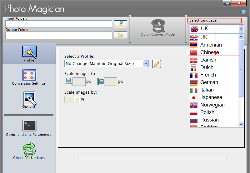 运行程序后在主界面的有上边的Select Language框中选择Chinese