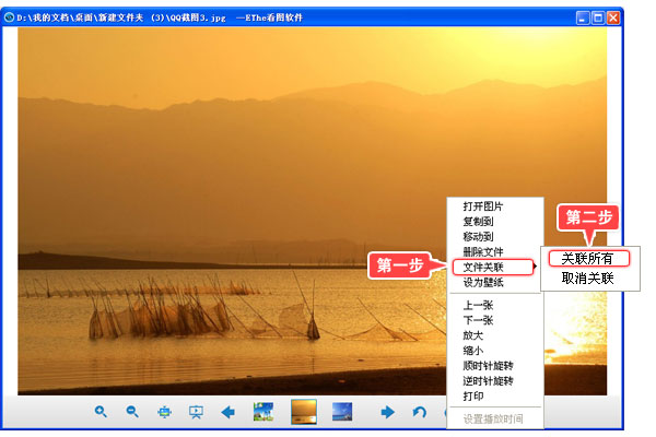 点击菜单按钮选则“文件关联”后选中“关联所有”完成关联所有图片文件,需要取消时选择“取消所有”侧取消所有图片文件关联。