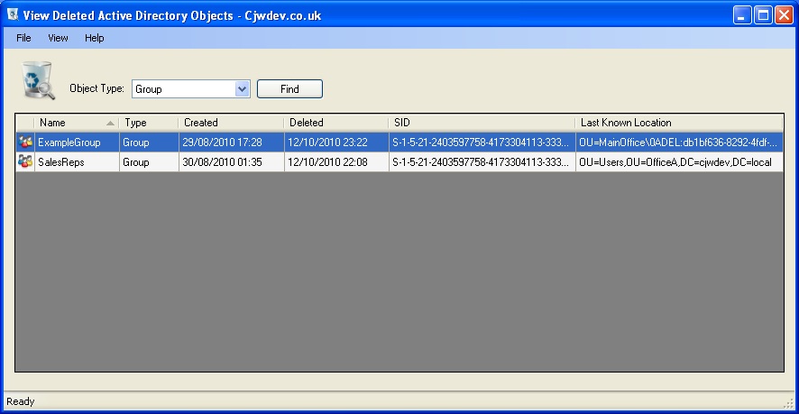 删除文件查找(View Deleted AD Objects)是一款快速找到删除电脑Active Directory对象的工具,只要选择文件对象的类型,就可以一键找到删除所有相关的信息,软件自动匹配信息,所选对象的类型。