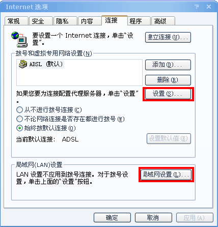 在“拨号和虚拟专用网络设置”中选择你的拨号连接,然后点击“设置”,如果您是局域网用户则点击“局域网设置”。