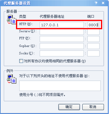 选择“代理设置(Proxy Servers)”,在“HTTP代理”处填入“127.0.0.1”,端口处填入“8800”,其它项全部为空。