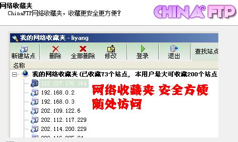 ChinaFTP是一款免费使用的FTP上传工具,软件功能强大,操作简单,传输速度非常快,数据传输稳定安全,自带网络收藏夹功能,可以随时访问收藏的站点,标签功能可以让你快速定位所有的文件,高稳定性、高控制性和高效的操作性,是款非常适合中国人使用的FTP上传客户端。