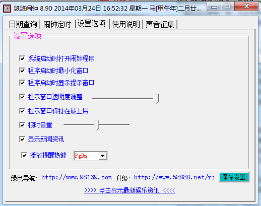 悠悠闹钟是款用来日期查询、闹钟定时的实用小工具,日期查询可以查询公历日期、农历日期、属相、星座,还可以Internet对时,闹钟定时可以设置整点报时、每天定时、明星报时,精心设计,完美报时。
