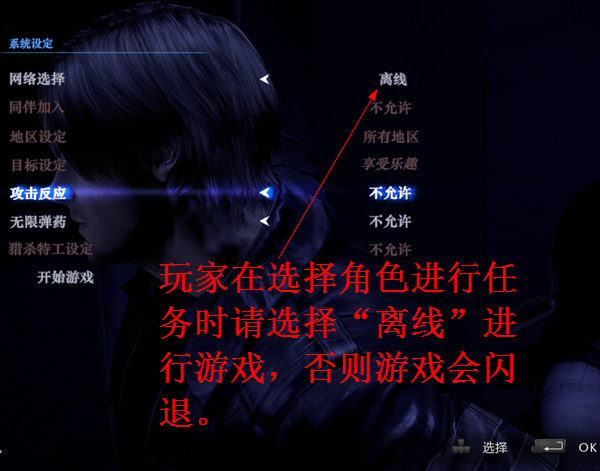 二、玩家在选择角色进行主线任务时,NETWORK SELECTION后面请选择offline,进行离线游戏,否则游戏会闪退。