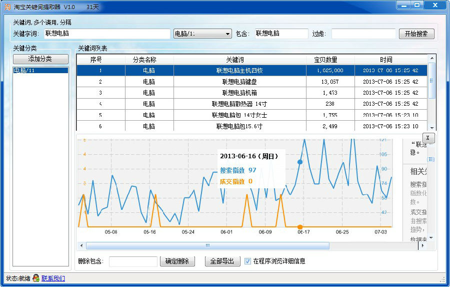 淘宝关键词提取器是一款通过关键词来提取用户搜索相关关键词,可以不断的读取选择关键词,来挖掘出更多关键词,还能提取关键词宝贝相关信息,宝贝分类名称、关键词、宝贝数量等信息,是淘宝卖家优化自己店铺宝贝关键词的必备工具。