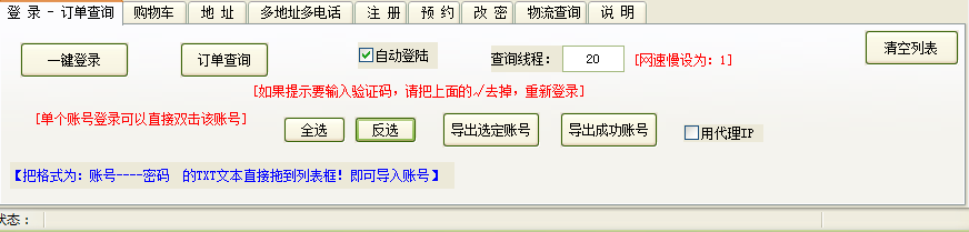 1、帐号批量导入登录格式:帐号----密码,以文本保存,直接拖拽到列表框。