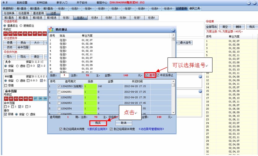 9、点击购买以后,会弹出购买确认列表,里面可以选择追号,最多可追100期,设定完追号期数以后,直接点击购买即可。