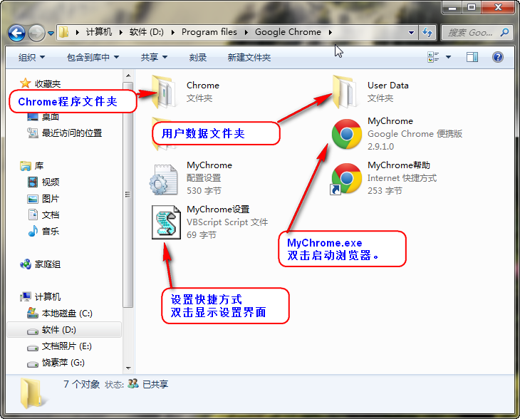 新建一个文件夹(下面以 D:\Program files\Google Chrome 文件夹为例),MyChrome 压缩包解压到这个文件夹中,双击运行 MyChrome.exe 显示设置窗口;
