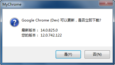 选择检查更新的频率和分支,MyChrome 会按您的设置检查浏览器更新。发现有新版Chrome / Chromium 浏览器时,默认会询问是否下载更新。经确认后,将会下载并提取新版浏览器程序文件到指定的“Chrome.exe 路径”。