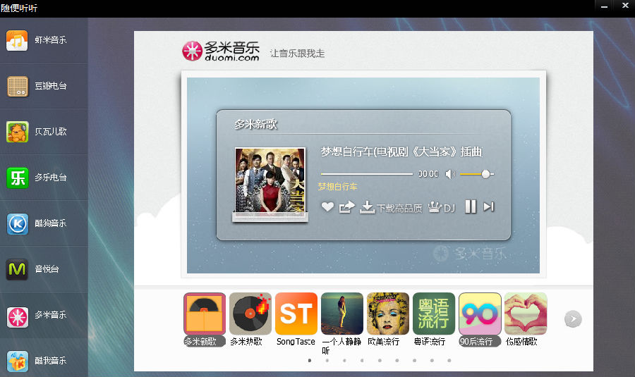 随便听听是一款在线音乐试听播放器,播放器界面精美、运行稳定,集合了虾米、豆瓣、多米、酷狗等多款音乐播放器于一体,所有音乐数据全部同步,音乐随心听,播放器任意切换,真正打造一个属于自己的全能音乐播放器。