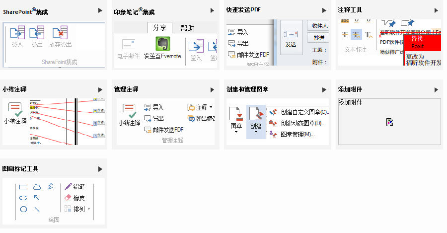 2、协作和共享:SharePoint集成、印象笔记集成、快速发送PDF、注释工具、小结注释、管理注释、创建和管理图章、添加附件、画图标记工具
