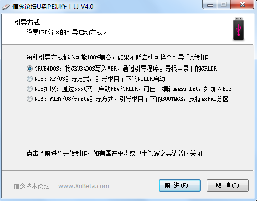 5、设置USB分区的引导启动方式,每种引导方式都不可能100%兼容,如果不能启动可换个引导重新制作