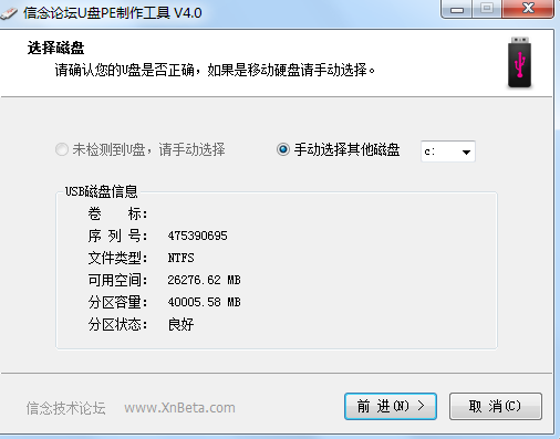 3、如果未检测到U盘,请手动选择,可以手动选择其他磁盘。