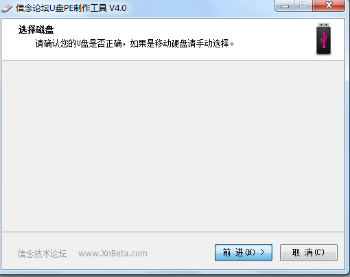 2、选择磁盘,请确认您的U盘是否正确,如果是移动硬盘请手动选择