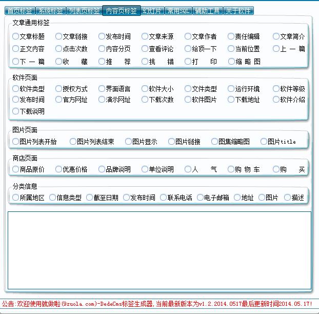DEDECMS标签生成器是一款方便各位站长使用织梦程序仿站时使用,工具集合了所有dedecms标签,通过网站各部分标签进行分类,所有的标签可以直接点击生成,就可以拿来调用。对于那些刚接触仿站的用户非常实用,不熟悉标签、记不住标签都可以使用这款标签工具。非常的方便,工具界面风格还支持自定义更换。