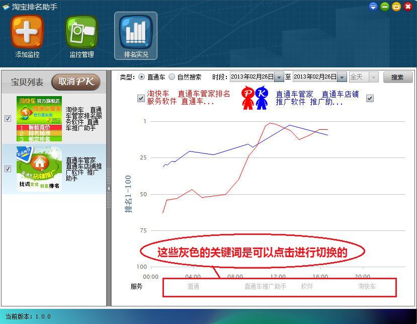 点击排名实况,可以显示宝贝的排名实况,可以是单个宝贝的图表曲线或者是直接选择2个宝贝进行图表的数据对比